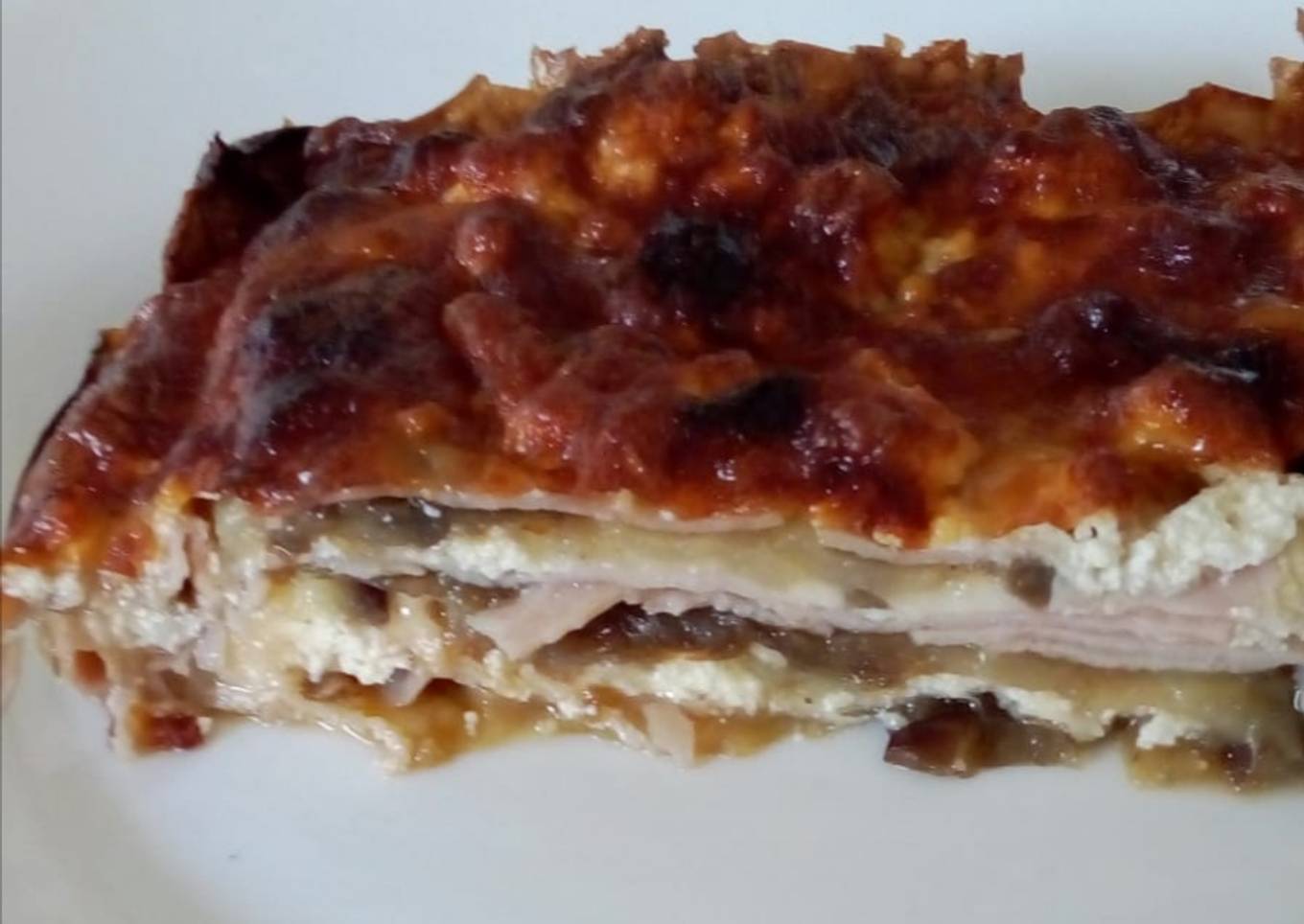 - En una fuente chica para horno o pyrex hacer capas intercaladas de berenjena, jamón, ricota, salsa y muzzarella. Seguir ese proceso hasta llegar hasta llenar la fuente (si dan los ingredientes 😁🤭) Culminar con muzzarella. Llevar a horno caliente por unos minutos para terminar de cocinar la berenjena, retirar del horno cuando esté dorada.