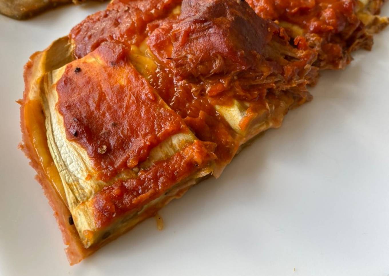 - Después de la hora, limpiar y presentar en una fuente. Como si fuera la masa de la lasaña, pero las capas con berenjenas. Capa de berenjenas, jamón y queso, berenjenas. Como opcional se le puede poner muchas cosas.