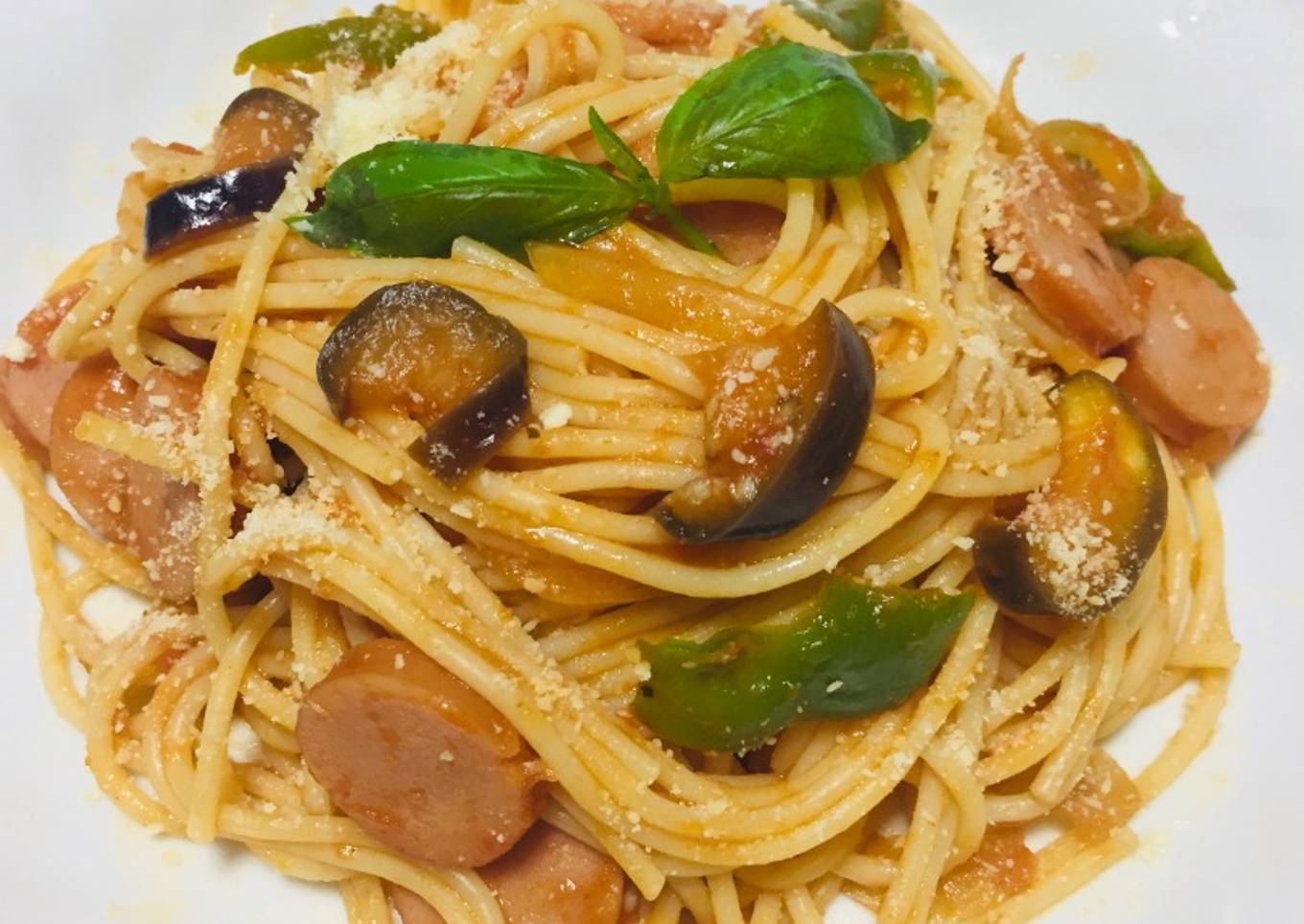 Spaghettis con Salchichas, berenjenas, pimientos verdes 🍆🍝