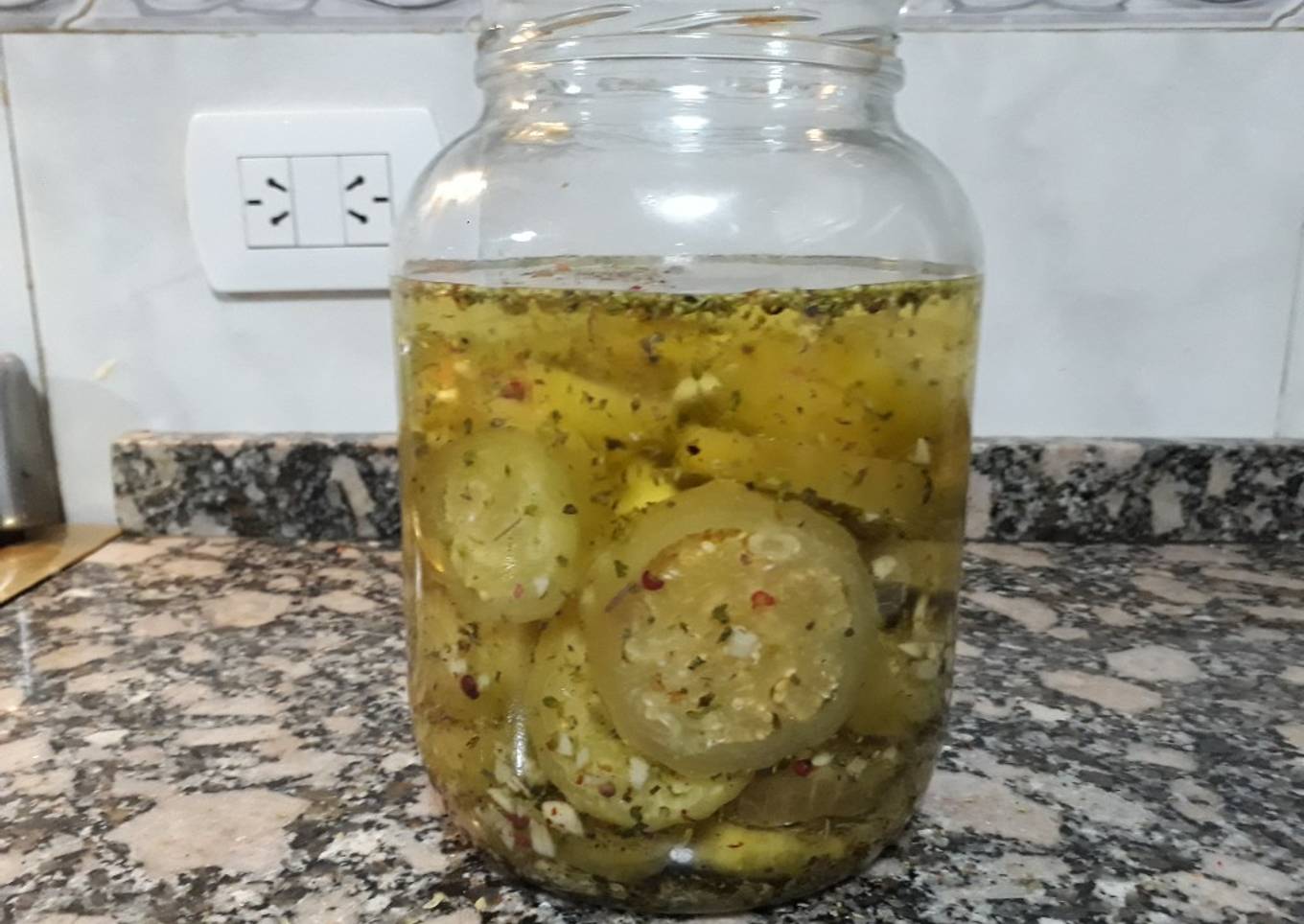 - Poner a hervir el agua con el vinagre y cuando rompa el hervor blanquear las berenjenas por 4 minutos. retirarlas y dejar enfriar un poco, poner en el frasco una poco de aceite con un poco de ajo, ají molido, pimienta, orégano y laurel, ir poniendo las berenjenas y repetir hasta terminar.