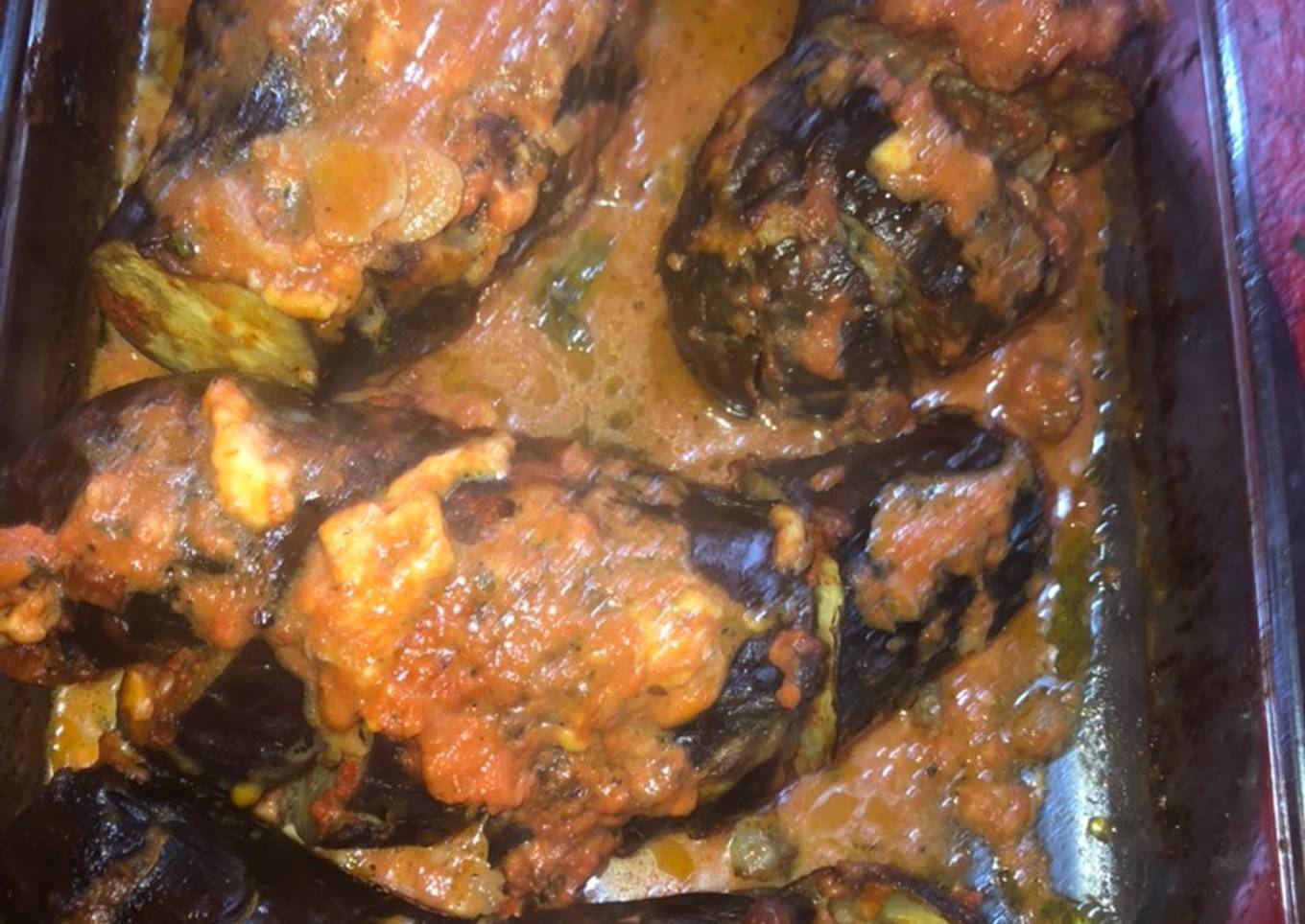 Berenjena rellena con carne, salsa de tomate y queso 😋