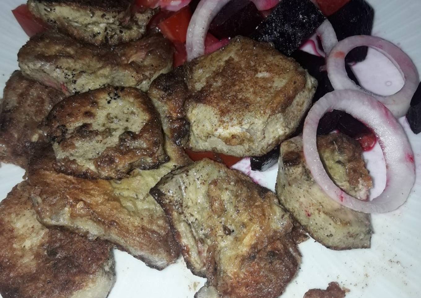 - En un plato arme una ensalada de tomates, aros de cebolla, y 1remolacha, adereze con pizca de sal, vinagre de manzana, y listo