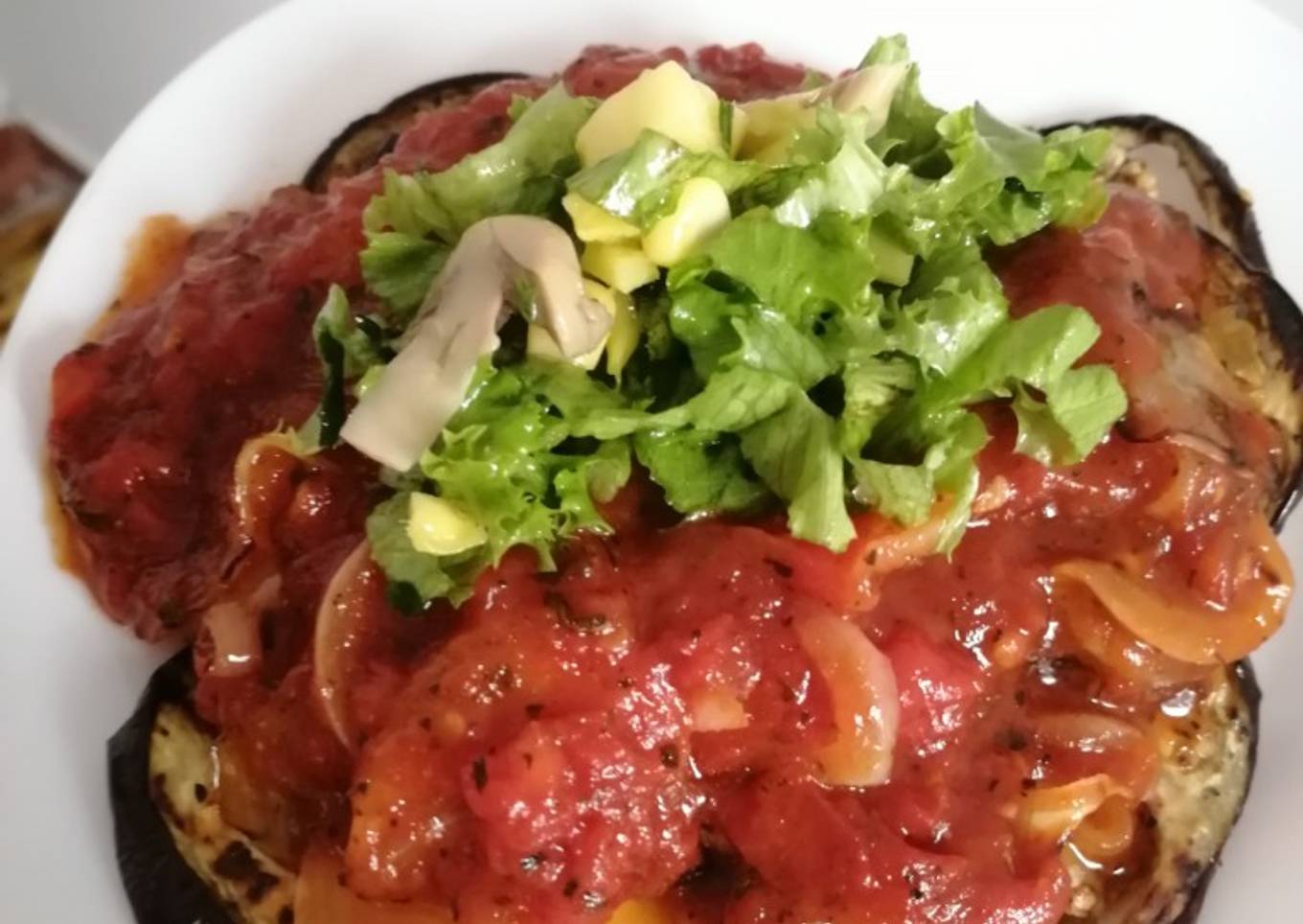- Prepárate para emplatar: pon una cama de las rodajas de berenjena 🍆 agrega salsa y si deseas queso mozzarella, otra capa de berenjenas y salsa hasta que alcance la salsa y decora con hojitas de Perejil o albahaca.