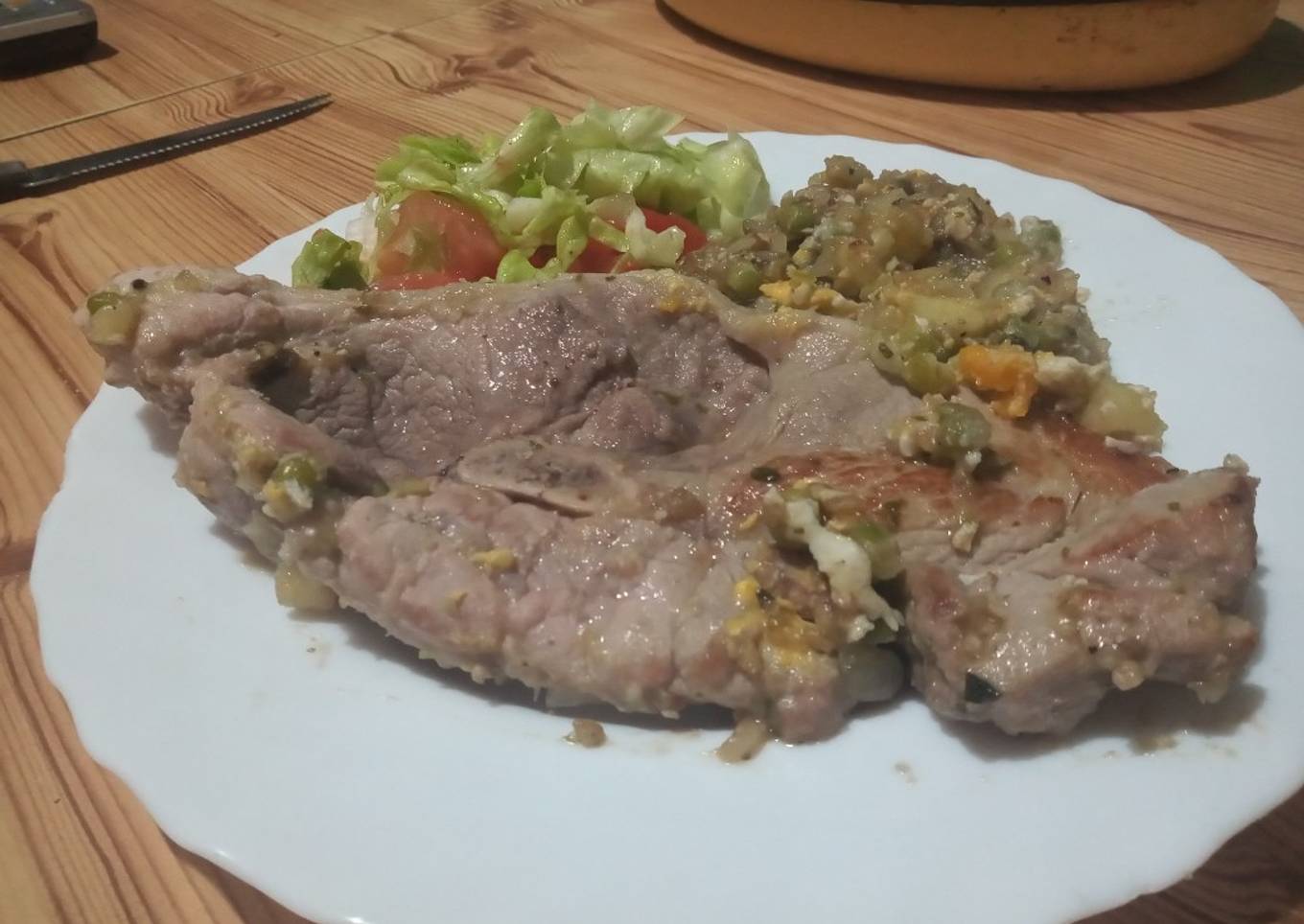 - Una vez doraditas agregar los churrascos (yo elegí corte de cerdo porque es lo que tenía a mano y es más económico pero puede ser el corte del animal que más les guste)
