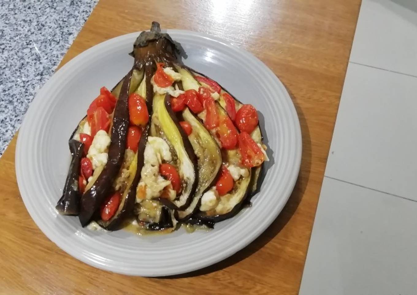 - Intercalar el queso y el tomate entre las láminas de berenjena. Rociar con aceite de oliva y llevar a horno bajo (150 gr.) por aprox. 45 minutos.