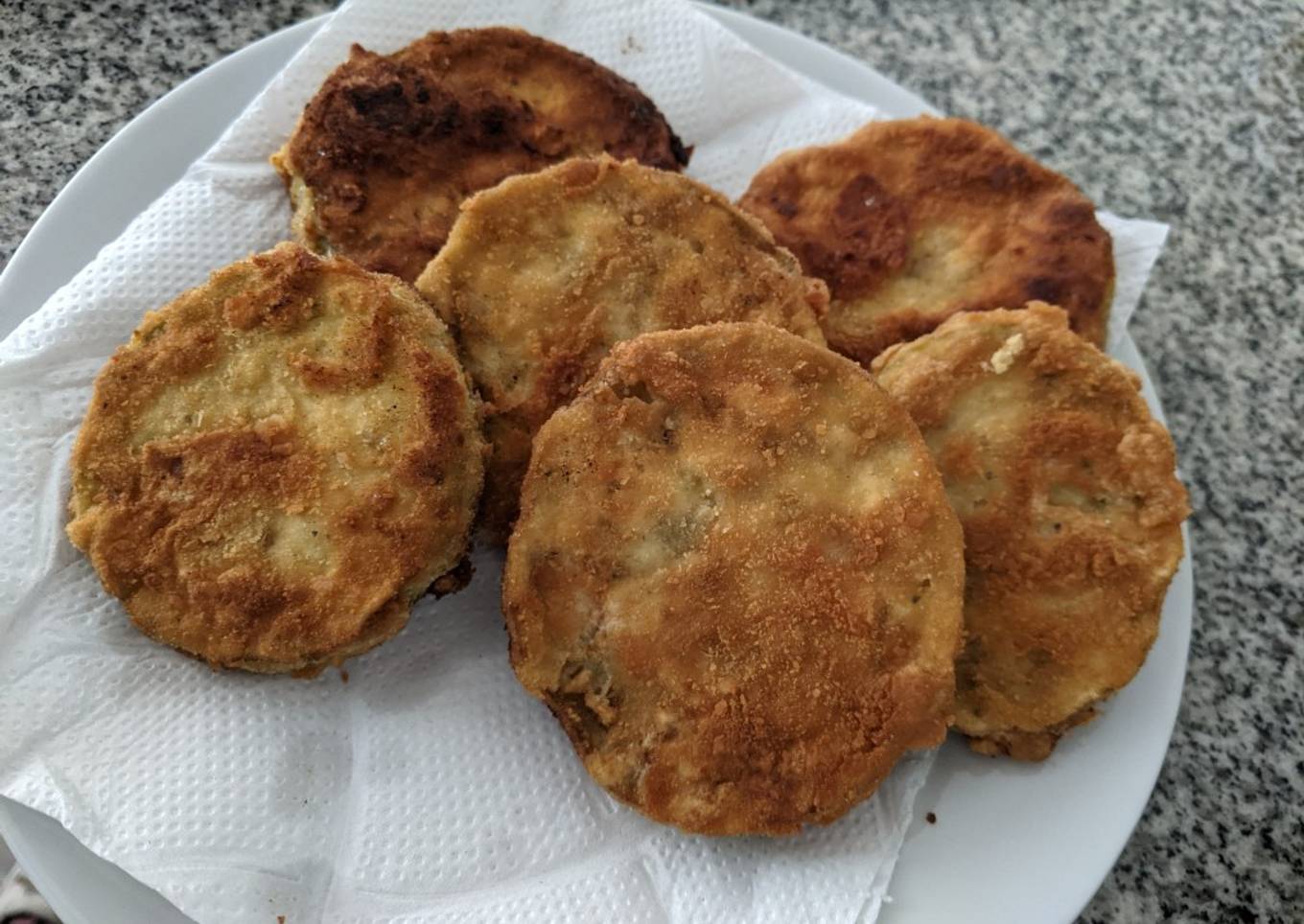 - Llevar a freír con abundante aceite cada una de las rodajas hasta que estén doradas (aprox 2 minutos por lado). Si tienes freidora de aire también la puedes usar, 10 min por lado a 200 C. Y listo a disfrutarlas.