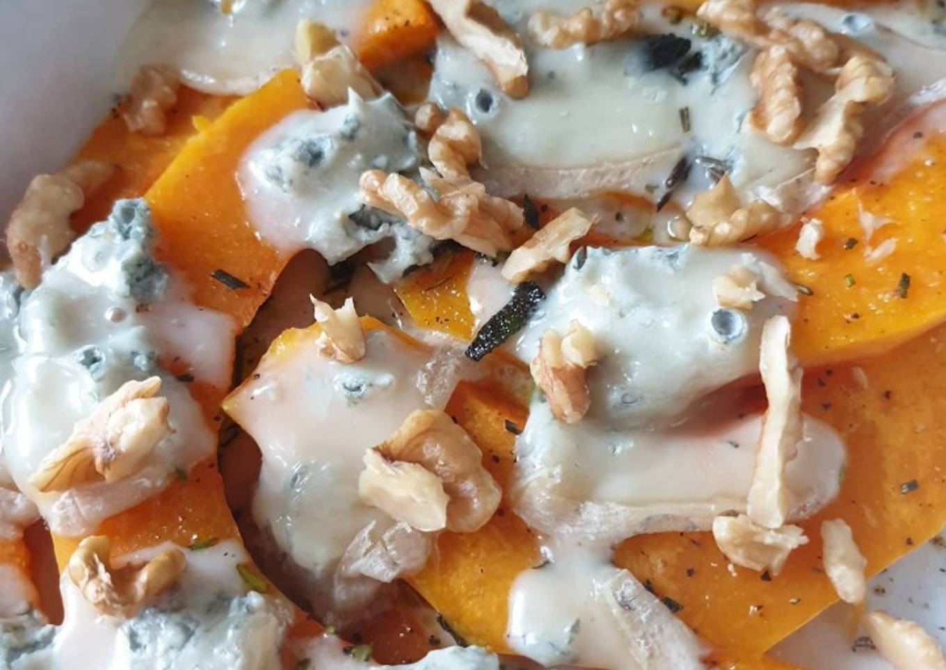 - Retirar la calabaza del horno, quitar el papel de aluminio y agregar rodajas finas de gorgonzola y las nueces picadas en trozos grandes. Cocinar por otros 10 minutes y servirla caliente.