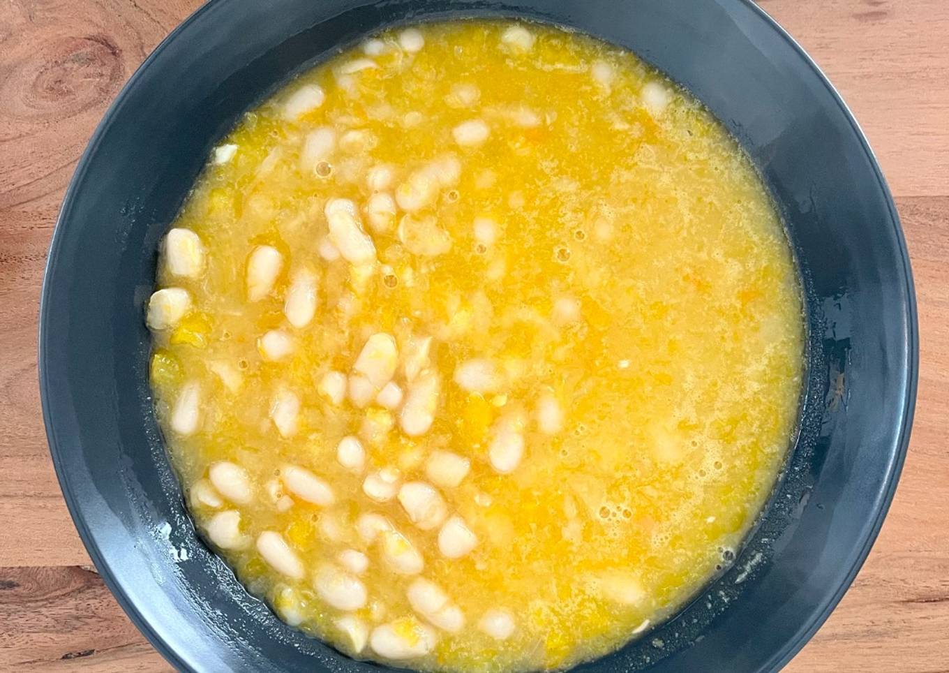 - Pon el sofrito en una olla, añade las alubias, la calabaza, sal y pimienta al gusto, y cúbrelas con el caldo.