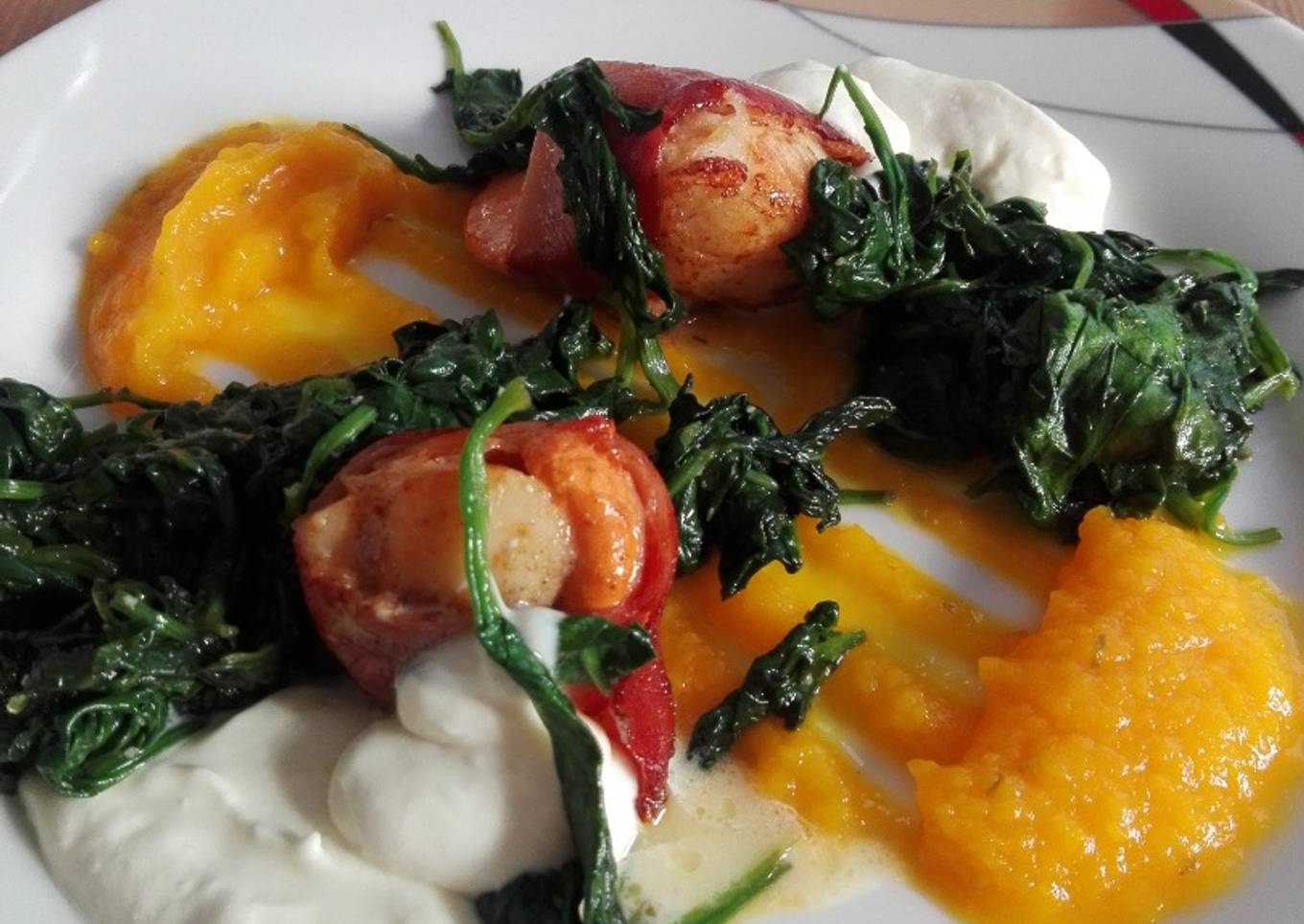Vieiras sobre puré de calabaza, espinacas y queso