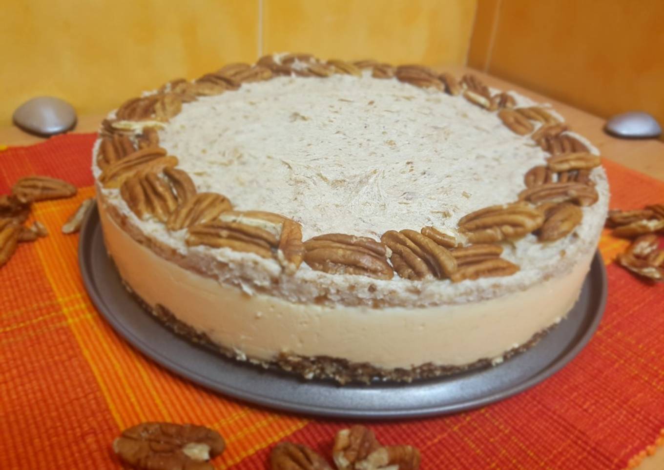 - Verter sobre la tarta. Decoramos con nueces pecanas. Lo dejamos 30 minutos en la nevera y después, a diafrutar