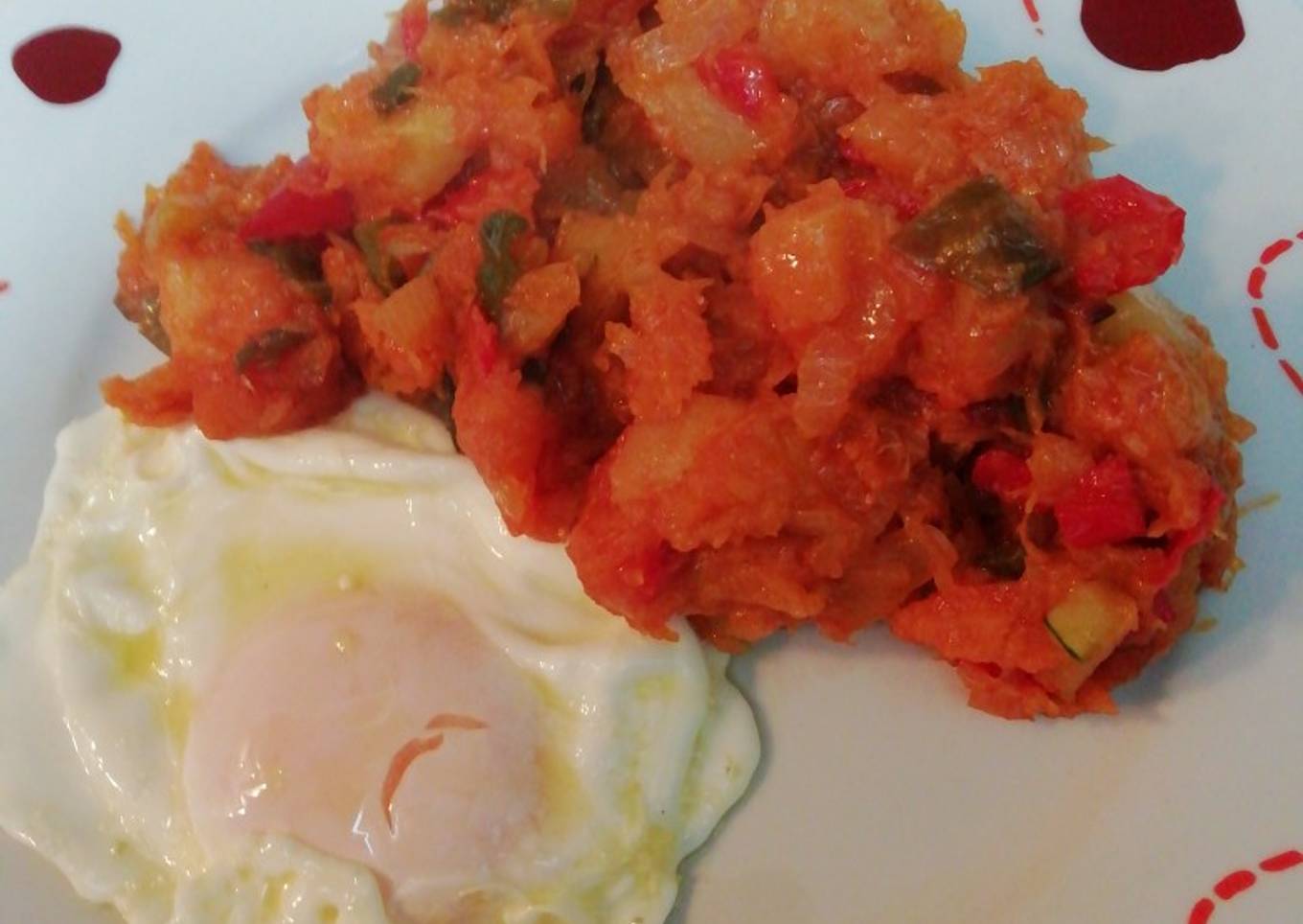 - En la misma sartén retiramos el excedente de aceite. Y añadimos primero los pimientos sofreímos unos minutos, después añadimos la cebolla y más tarde el calabacín. Añadimos sal al gusto. Cuando todo esté blandos añadimos la calabaza reservada y unas cucharadas de tomate frito mezclamos bien y listo!